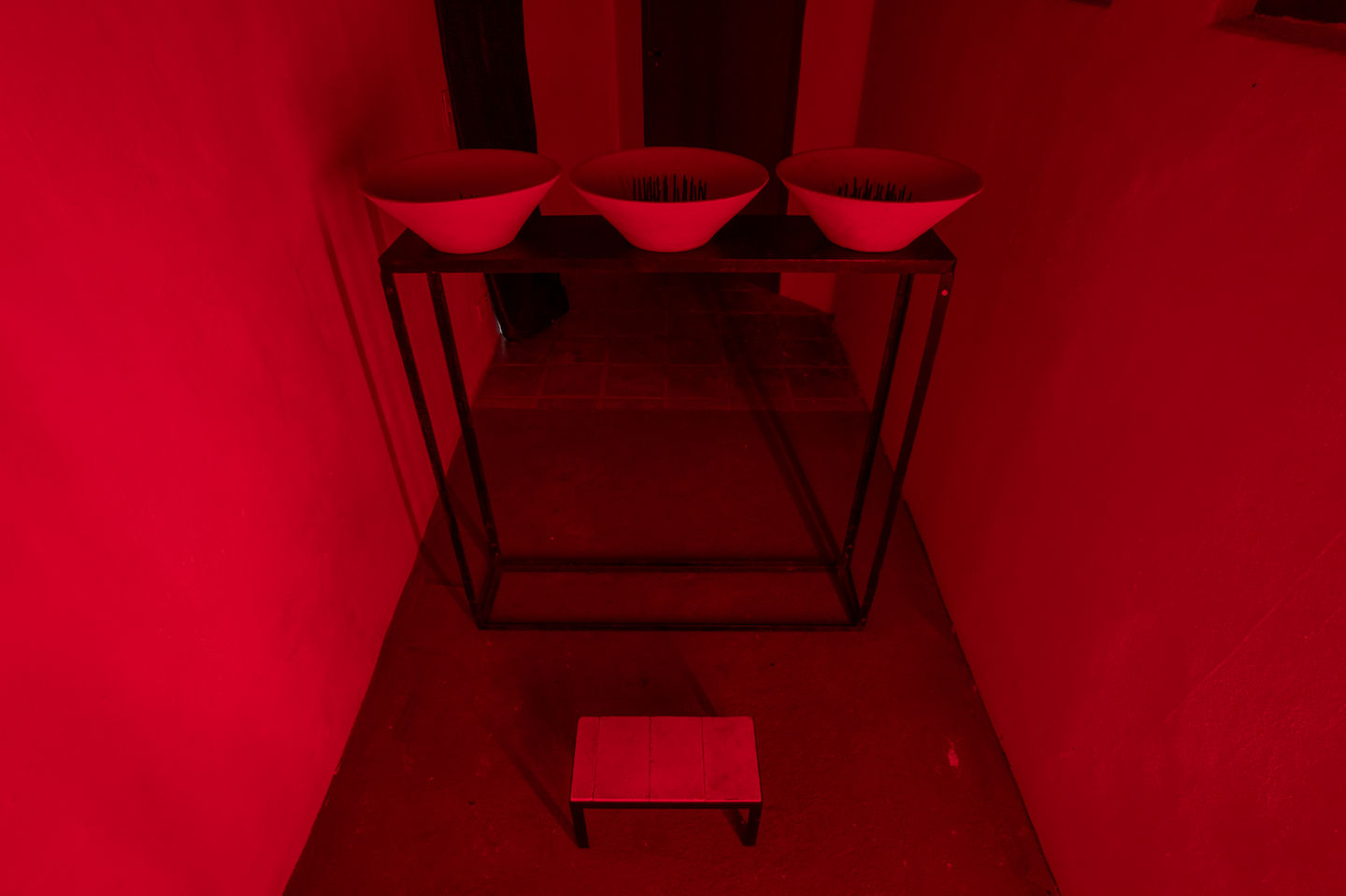A contribuição de Rosana Bortolin, com sua Oferenda I – Série alguidares (1998), estabelece um elo visceral com a dimensão do corpo-sagrado e do ritual. Os alguidares, frequentemente associados a oferendas em ritos afro-brasileiros, e os pregos, que podem evocar tanto a dor quanto a fixação de um propósito, aprofundam a discussão sobre o corpo como palco de práticas devocionais, sacrifícios e conexões com o transcendental. A presença dos pregos em sua obra ecoa a materialidade agressiva e contundente dos pregos na obra Corpo de Smekatz, estabelecendo uma continuidade de linguagens e simbologias. As obras, assim, nos remetem ao corpo não apenas como um organismo, mas como um sujeito que interage com o mundo, sente, age e se manifesta ritualisticamente.